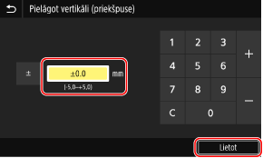 Norādiet regulēšanas platumu, izvēloties pozitīvu vērtību, lai regulētu papīru virzienā uz leju, vai negatīvu vērtību, lai regulētu to virzienā uz augšu.