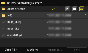 Lai atlasītu visus parādītos failus, ekrāna apakšā piespiediet [Atlasīt visu]. Ja tajā redzami gan PDF faili, gan attēli (JPEG vai TIFF faili), tiks parādīts ekrāns faila tipa atlasīšanai. Šajā ekrānā atlasiet faila tipu, kuru vēlaties drukāt.