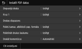 * Šis ir tas pats iestatījums kā [N uz 1] atmiņas datu nesēja drukas iestatījumu ekrānā. Tomēr opcija [9 uz 1] un [16 uz 1] funkcijai [N uz 1] ir pieejama tikai ekrānā [Iestatīt PDF datus].