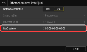 Ja iekārtai ir izveidots savienojums ar vadu LAN, varat skatīt iekārtai iestatīto MAC adresi.