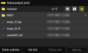 Kõigi kuvatud failide valimiseks vajutage kuva allosas [Vali kõik]. Kui mäluseadmes on nii PDF- kui ka pildifaile (JPEG või TIFF), avatakse failitüübi valimise kuva. Valige sellel kuval failitüüp, mida soovite printida.