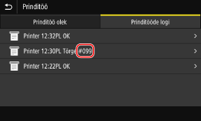 Kui ei saa printida, I-faksi saata või vastu võtta või tekib muu tõrge, kuvatakse tööde logis tõrkekood (kolmekohaline arv märgi # järel).