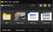 Inseriu el dispositiu de memòria USB a l'equip i, a la pantalla [Inici], premeu [Impressió disp. memòria] per mostrar els fitxers i carpetes del dispositiu de memòria USB.