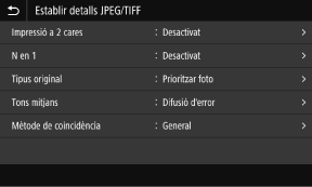 Utilitzeu aquesta pantalla per configurar les opcions d'impressió detallades per als fitxers JPEG i TIFF, com ara ajustar la qualitat de la imatge.