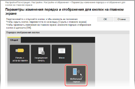 Для изменения порядка отображения кнопок на экране [Главный] и переименования вкладок можно использовать удаленный ИП на компьютере.