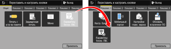 Можно изменять порядок отображения кнопок на экране [Главный] и перемещать кнопки на другие вкладки.