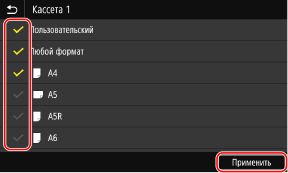 Снимите флажки рядом с форматами бумаги, которые требуется скрыть, и нажмите кнопку [Применить].