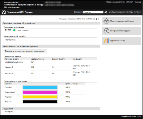 После входа в удаленный интерфейс пользователя открывается страница его портала. На ней можно проверить состояние операций аппарата, просмотреть различную информацию и изменить настройки с помощью соответствующих кнопок.