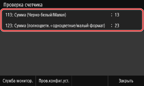 Операции, которые можно выполнить на экране просмотра счетчикаЭлементы, отображаемые на экране, зависят от страны или региона. Нажмите [Служба монитор.], чтобы проверить соединение с сервером мониторинга. Выполните эту операцию, чтобы регулярно отправлять информацию об аппарате на сервер мониторинга. Нажмите [Пров.конфиг.уст.], чтобы проверить конфигурацию параметров аппарата.