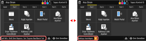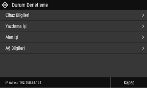 [Ana Ekran] üzerinde ve diğer konumlarda [Drm Denetlme] öğesine bastığınızda bu ekran görüntülenir. Makine bilgilerini, kullanımı ve günlükleri, ağ ayarlarını ve hata bilgilerini kontrol etmek için bu ekranı kullanın. [Durum Denetleme] Ekranı