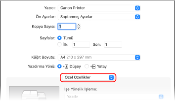 Yazdırma seçenekleri açılır menüsünden [Özel Özellikler] öğesini seçin.
