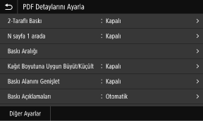 Ekranı görüntülemek için Bellek Ortamı Yazdırma ayarları ekranında [PDF Detayları Ayarla] öğesine basın.