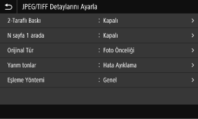 JPEG ve TIFF dosyalarına yönelik ayrıntılı yazdırma ayarlarını (görüntü kalitesini ayarlama gibi) yapılandırmak için bu ekranı kullanın.