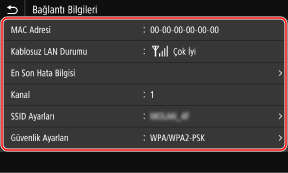 Makine kablosuz LAN'a bağlı olduğunda, kablosuz LAN'ın MAC adresi ve bağlantı bilgilerine ek olarak güvenlik ayarlarını da görüntüleyebilirsiniz.