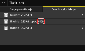Če tiskanja ni mogoče izvesti, če I-faksa ni mogoče prejeti ali če pride do druge napake, je v dnevniku opravil prikazana koda napake (trimestno število, ki se začne z »#«).