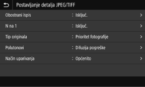 Da bi se zaslon prikazao, pritisnite [Pos. detalja JPEG/TIFF] na zaslonu postavki ispisa s memorijskog medija.