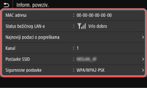 Kada je uređaj spojen na bežični LAN, uz MAC adresu i podatke o vezi za bežični LAN možete pregledati i sigurnosne postavke.