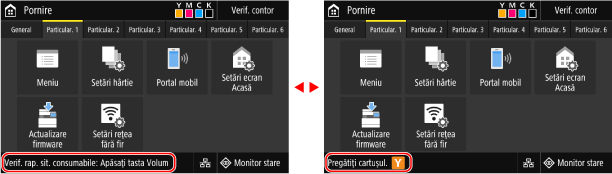 ] pe panoul de operare. În mod implicit, ecranul [Pornire] este afișat imediat după cuplarea alimentării electrice și imediat după închiderea ecranului de pornire, respectiv imediat după conectare. Ecranul [Pornire]
