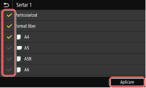 Formatele de hârtie ale căror casete de selectare sunt debifate nu sunt afișate pe ecranul cu setările hârtiei.