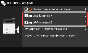 По подразбиране размерът и типът на хартията са зададени на A4 и Обикновена 2. Когато се зарежда хартия с различен размер или тип, променете настройките на хартията.