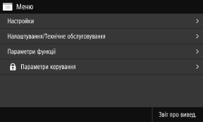 Змінення інтерфейсу екранаВи можете змінити інтерфейс панелі керування, наприклад змінити мову інтерфейсу й одиниці вимірювання та показати чи приховати повідомлення. [Параметри відображення] Можна інвертувати кольори екрана й налаштувати яскравість, щоб полегшити перегляд вмісту екрана. [Спеціальні можливості] Автоматичне очищення параметрівЗа замовчуванням, якщо після певного періоду часу не виконуються жодні операції, буде очищено параметри, які налаштовуються на екрані, і відобразиться екран [Головний]. Можна змінити час, що минає до очищення параметрів, і екран, який відображається після цього. [Час автоматичного скидання] [Функція після авт. скидання] |