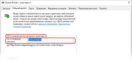 На вкладці [Sharing] установіть прапорець [Share this printer] і введіть мережеве ім’я.