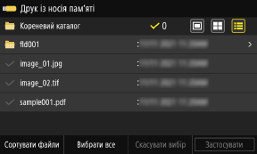 Щоб вибрати всі показані файли, натисніть [Вибрати все] внизу екрана. Якщо одночасно вибрати файли у форматі PDF і зображення (файли JPEG або TIFF), відобразиться екран вибору типу файлів. Виберіть на ньому тип файлів, які потрібно надрукувати.