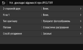 На цьому екрані можна налаштувати детальні параметри друку для файлів у форматах JPEG і TIFF, і таким чином відрегулювати якість зображення.