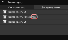 Якщо неможливо виконати друк або отримати інтернет-факс, а також у разі іншої помилки, у журналі завдань відображається код помилки (тризначний номер, який починається із символу «#»).