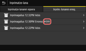 Ezin baduzu inprimatzea burutu, ezin baduzu I-faxa jaso edo beste erroreren bat gertatzen bada, errore kodea (“#” ikurrarekin hasten den hiru digituko zenbakia) bistaratuko da lan-egunkarian.