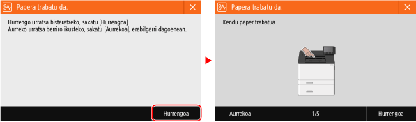 Ez egin indarrik trabatutako papera edo dokumentu bat ateratzerakoan makinatik.Papera indarrez kentzeak lesio pertsonalak eragin edo makinaren atalak kalte ditzake. Papera kendu ezin baduzu, jarri harremanetan banatzaile edo zerbitzu-hornitzailearekin. Arazoak jarraitzen badu