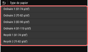 Lorsque du papier est chargé dans le bac multifonctions, l'écran de paramétrage du format et du type de papier s'affiche sur le panneau de commande.