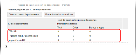 Puede ver el número de páginas que se imprimen en cada ID de departamento cuando la Gestión de ID de departamentos está habilitada.