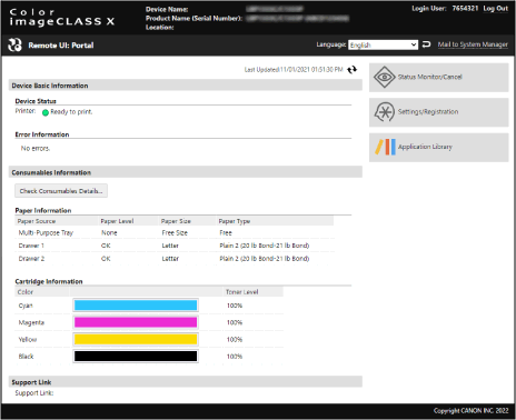 When you log in to Remote UI, the Portal page (Remote UI top page) appears. From here you can check the operations status of the machine, view various information, and change the settings with button operations.
