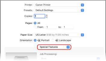From the print options pop-up menu, select [Special Features].