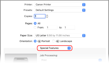2 | From the print options pop-up menu, select [Special Features]. If print options are not displayed, click [Show Details] in the printing dialog box. |
