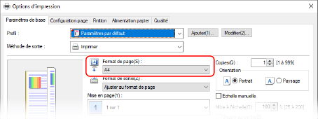 Dams [Format de sortie], sélectionnez le format de papier pour l’impression. Le document est agrandi ou réduit pour correspondre au format du papier dans [Format de sortie].