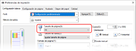 En [Tamaño de página] en la pestaña [Configuración básica], seleccione el tamaño de papel del documento.