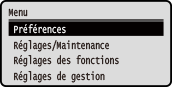 Modification de l'affichage de l'écranVous pouvez modifier l'affichage du panneau de commande, par exemple en changeant la langue et les unités d'affichage, ou en affichant ou en masquant les messages. [Réglages d'affichage] Vous pouvez inverser les couleurs de l'écran et régler la luminosité pour que l'écran soit plus facile à voir. [Accessibilité] Effacement automatique des paramètresPar défaut, si aucune opération n'est effectuée après un certain laps de temps, les paramètres configurés sur l'écran sont effacés et l'écran [Accueil] s'affiche. Vous pouvez modifier le délai d'effacement des paramètres et l'écran qui s'affiche ensuite. [Délai réinit. automatique] [Fonction après réinit. auto.] |