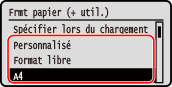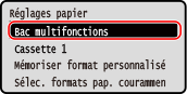 Lorsque du papier est chargé dans le bac multifonctions, l'écran de paramétrage du format et du type de papier s'affiche sur le panneau de commande.