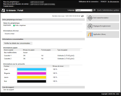 Lorsque vous vous connectez à l'interface utilisateur distante, la page Portail (page d'accueil de l'interface utilisateur distante) s'affiche. Depuis cette page, vous pouvez vérifier l'état d'utilisation de l'appareil, afficher diverses informations et changer les paramètres au moyen de boutons.