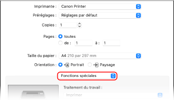 2 | Dans le menu contextuel des options d'impression, sélectionnez [Fonctions spéciales]. Si les options d’impression ne s’affichent pas, cliquez sur [Afficher les détails] dans la boîte de dialogue d’impression. |