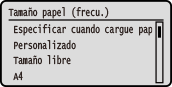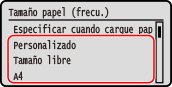 Cuando se carga papel en la bandeja multiuso, aparece la siguiente pantalla en el panel de control. Configure el tamaño y el tipo de papel según el papel cargado.