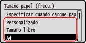 Si necesita cambiar con frecuencia el papel que se va a cargar, configure esta opción como [Tamaño libre]; esto reducirá el número de pasos necesarios para cambiar el ajuste cada vez. También puede mostrar un mensaje de error cuando el ajuste del controlador de la impresora sea significativamente diferente del tamaño del papel cargado.