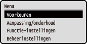 Een andere schermweergave kiezenU kunt het scherm van het bedieningspaneel veranderen: bijvoorbeeld andere schermtaal en eenheden kiezen, en berichten weergeven / verbergen. [Weergave-instellingen] U kunt schermkleuren omkeren en de helderheid aanpassen zodat u makkelijker naar het scherm kijkt. [Toegankelijkheid] De instellingen automatisch wissenStandaard worden, als er gedurende een bepaalde periode geen bewerkingen worden verricht, de op het scherm gekozen instellingen gewist, en verschijnt het scherm [Start]. U kunt zelf een periode kiezen en ook het scherm dat na deze inactiviteitsperiode verschijnt. [Automatische resettijd] [Functie na automatische reset] |