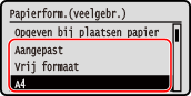 Als u het formaat van het te laden papier vaak moet veranderen, selecteert u [Vrij formaat]. Dit vermindert het het aantal stappen dat iedere keer moet worden verricht om de instellingen te veranderen. Tevens kunt u instellen dat er een foutmelding verschijnt als het in het printerstuurprogramma ingestelde papierformaat verschilt van het formaat van het geladen papier.