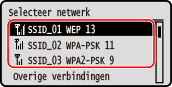 Zoeken naar een draadloos LAN-router (toegangspunt) waarmee u verbinding wilt maken, en de netwerksleutel invoeren. Als u verbindt via de toegangspunt-installatiemethode, worden de volgende verificatie- en versleuteling-methoden ingesteld: WEP-verificatiemethode: Open systeem Versleuteling voor WPA/WPA2: AES-CCMP of TKIP wordt automatisch ingesteld overeenkomstig de geselecteerde draadloos LAN-router. Om een andere verificatie- en versleuteling-methode op te geven, gebruikt u de handmatige installatiemethode om verbinding te maken. Verbinding maken met een draadloos LAN door de details in te stellen (handmatige installatiemethode) |