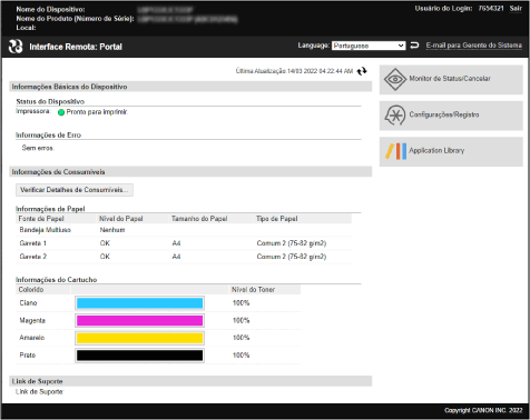 Quando inicia sessão na IU remota, aparece a página do portal (página superior da IU remota). Aqui, pode verificar o estado de funcionamento da máquina, visualizar várias informações e alterar as definições com o botão de operações.