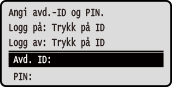 Når Administrere avdelings-ID er satt opp, vises følgende skjermbilde for innlogging. Skriv inn avdelings-ID når du vil logge inn. Hvis det er angitt en PIN-kode, skriver du inn denne.
