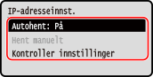 2 | Konfigurer innstillingen for automatisk innhenting etter behov. [Velg protokoll] Vanligvis stilt inn til [DHCP]. Når [DHCP] imidlertid er stilt inn i et miljø der DHCP ikke kan brukes, vil maskinen fortsette å bekrefte automatisk innhenting i nettverket, noe som fører til unødvendig kommunikasjon. Når du ikke bruker DHCP, stiller du denne inn til [Av]. [Auto-IP] Vanligvis stilt inn til [På]. Selv om prioritet gis til IP-adresser som er tildelt med DHCP, vil automatisk IP bli brukt hvis det ikke kommer respons fra DHCP. |